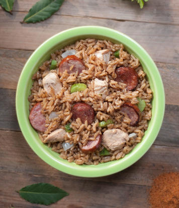 This dish makes good use of the Holy Trinity, a Cajun method of caramelizing green bell peppers, onion and celery. Roux, a fat-and-flour based thickening agent toasted until golden brown, lends jambalaya its signature creaminess and depth.
