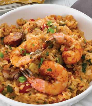 Jambalaya is a true comfort food, most often prepared in bulk for celebrations or communal meals. Typically, a combination of rice, chicken, andouille sausage, seafood and vegetables make up this warm, hearty dish, which is similar to a Spanish paella or West African jollof rice.
