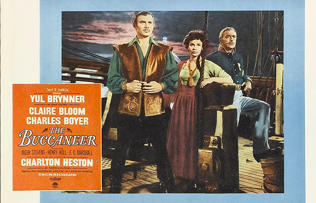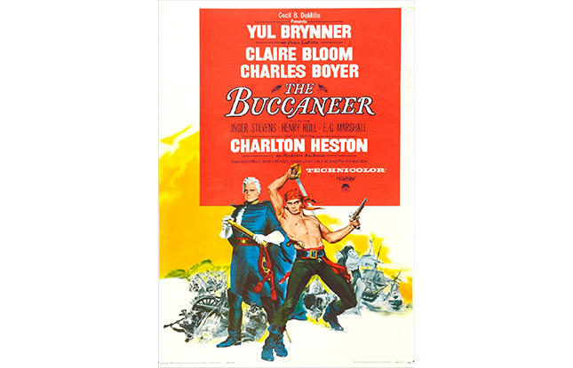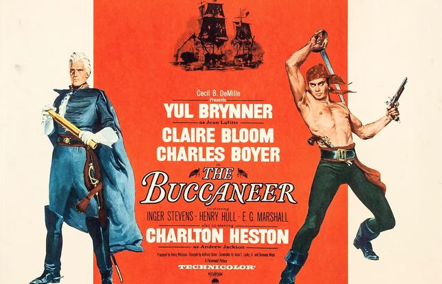 The Buccaneer tells the story of Jean Lafitte, the nefarious pirate, during the War of 1812 and the attempt of the British to capture New Orleans. The film was shot on location around New Iberia, LA. The Shadows-on-the-Teche Plantation served as Governor Claiborne’s mansion in the filmHowever, not everyone was pleased with this film. Henri de Balther Claiborne, the great-grandson of former Louisiana governor William Claiborne, filed a lawsuit for damages against Paramount, claiming that the film was a "slanderous misrepresentation" because it depicted a romance between Lafitte and a daughter of Claiborne. In reality, Claiborne's first daughter had died years before the fictional romance could have taken place, while his younger daughter was born in the mid-1810s. The film features the likes of Charlton Heston, Yul Brynner, Claire Bloom and more.